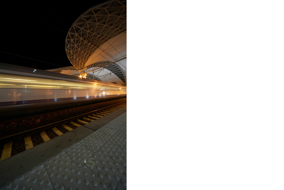 Wachtend op ’t perron maakte ik deze foto van een vertrekkende trein. Ik hou wel van wat beweging in nachtfoto’s, en dit is op dat vlak zowat het beste resultaat dat ik ooit heb geboekt. Wat deze foto beter maakt dan de anderen in deze serie, was het feit dat de belichting (in totaal 25s) start voordat de trein vertrok, indien je goed kijkt zie je de binnenverlichting van de verschillende tafeltjes.