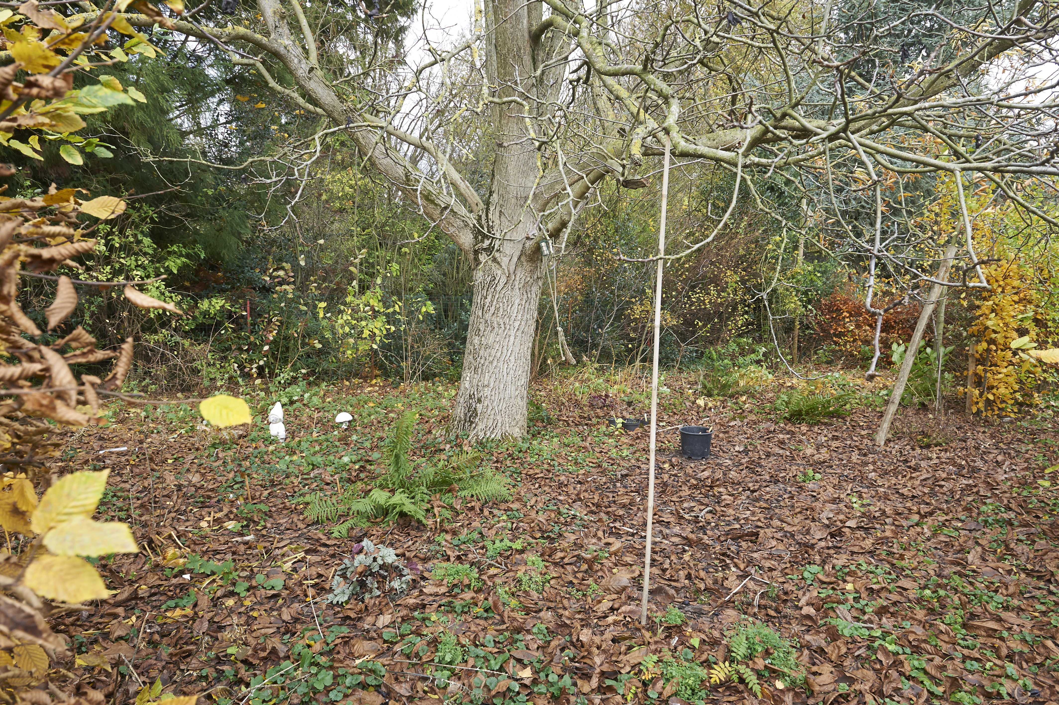 De Hosta zijn al lang verdwenen, de varens blijven groen. De notelaars is op één dag alle blad kwijt geraakt. Dat mag blijven liggen tot begin volgend jaar.