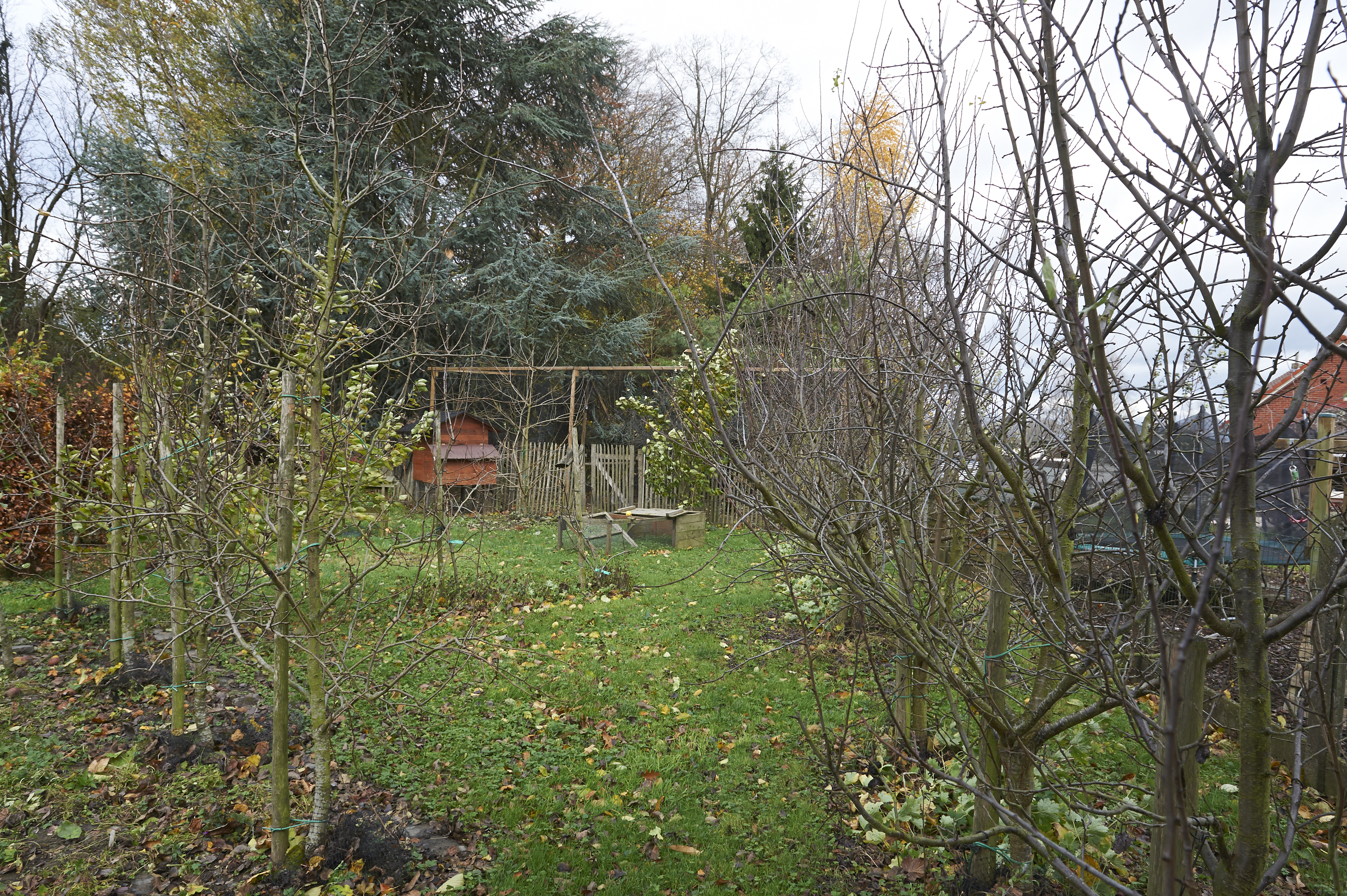 Zo mogelijk nog een pak kaler dan een maand geleden. De haagbeuk zorgt voor een beetje herfstgeel. De grijze emmer in ’t midden van ’t gras schermt een woelmuisval af.