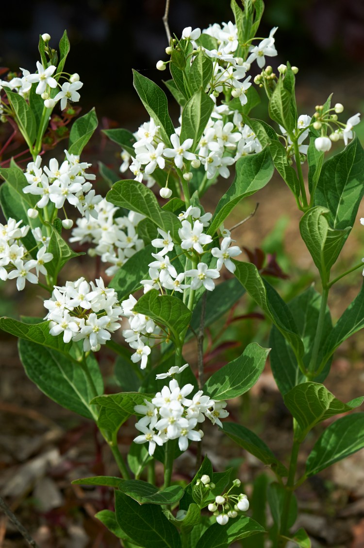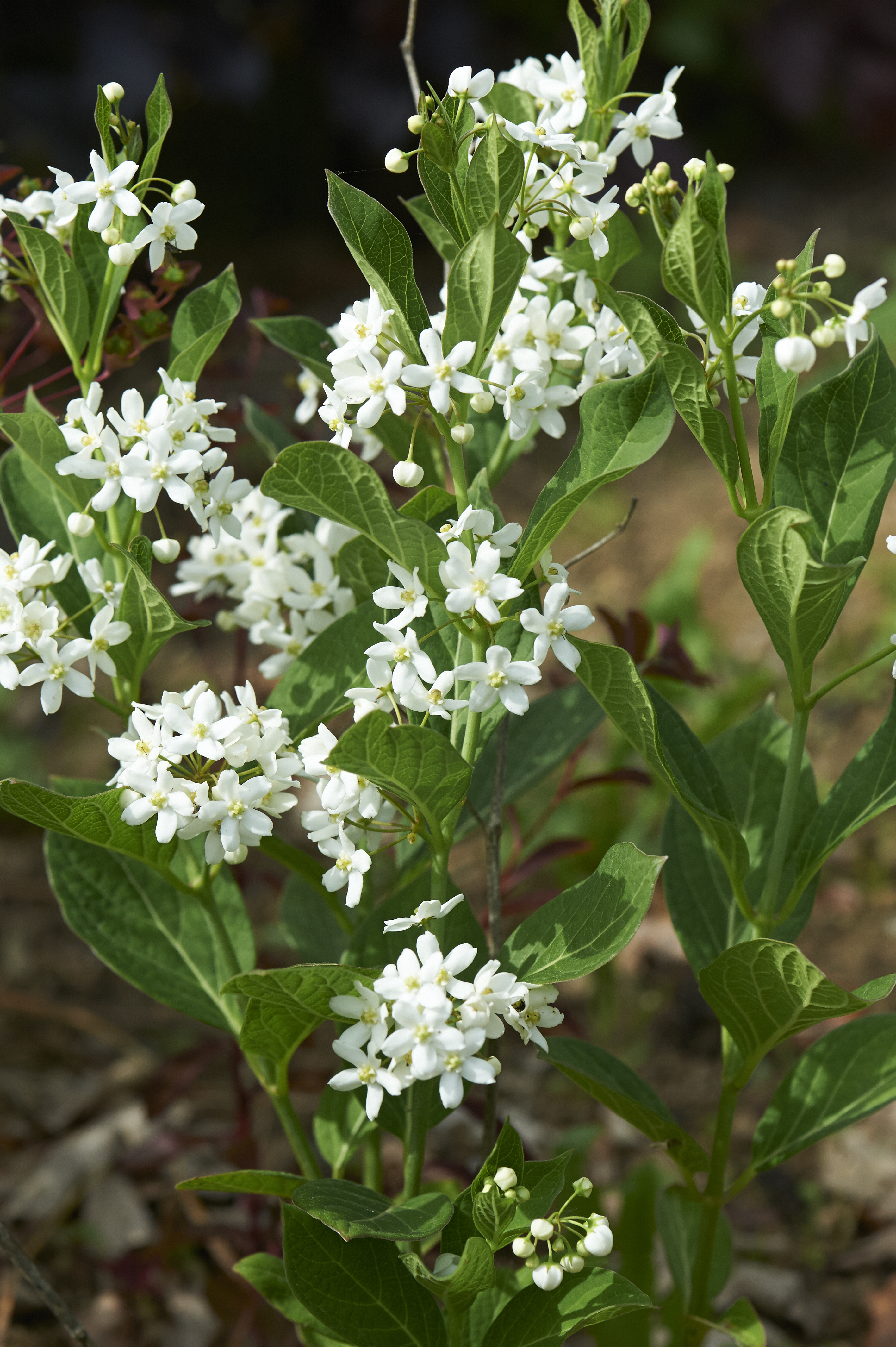 “een dunstelige opgaande kleine plant met glimmend donkergroen, puntig, hard blad. Hij bloeit in juni met kleine losse schermen heerlijk geurende witte bloemen als die van een Jasmijn, hoogte 40cm ongeveer. Een hele leuke plant om op de voorgrond een flinke groep van te planten, ze geven een mooi strak beeld en ze zijn sterk. Volle zon.”