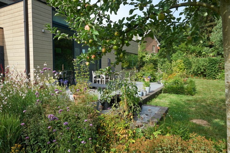 Rond het terras is staat er heel wat in bloei, meer neigen de kleurtjes nu meer naar wit dan geel . Een rijke appeloogst aan de appelaar…