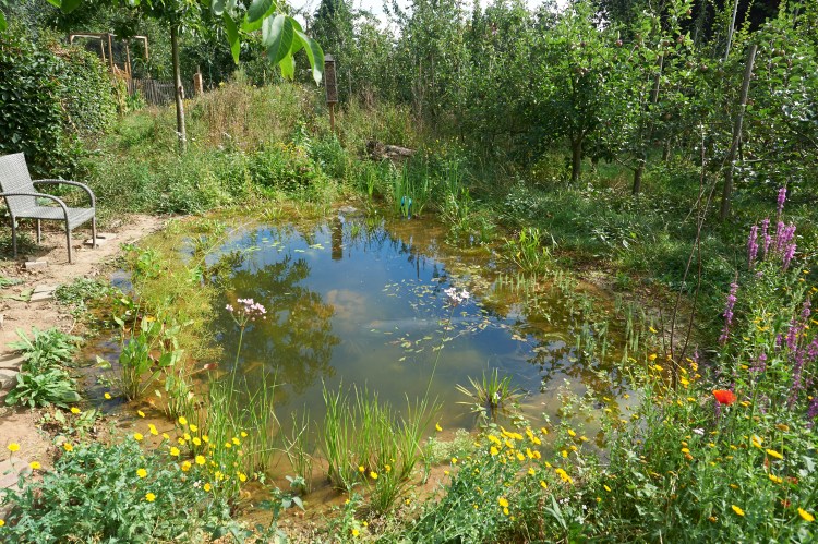 De vijver is weer wat meer begroeid, maar rondom blijft alles kaal door de droogte. Ook het wateroppervlak is weer iets meer bedekt (maar nog lang niet genoeg).