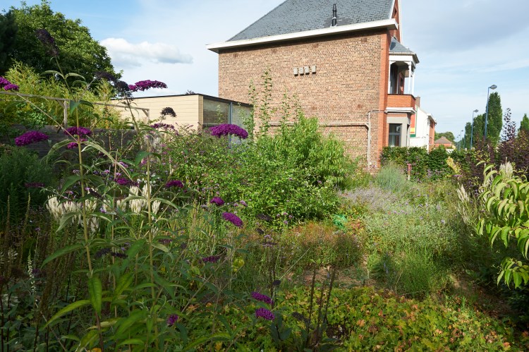 In de voortuin domineert het paars van  Verbena bonariensis, begeleid door Cephalaria gigantea.