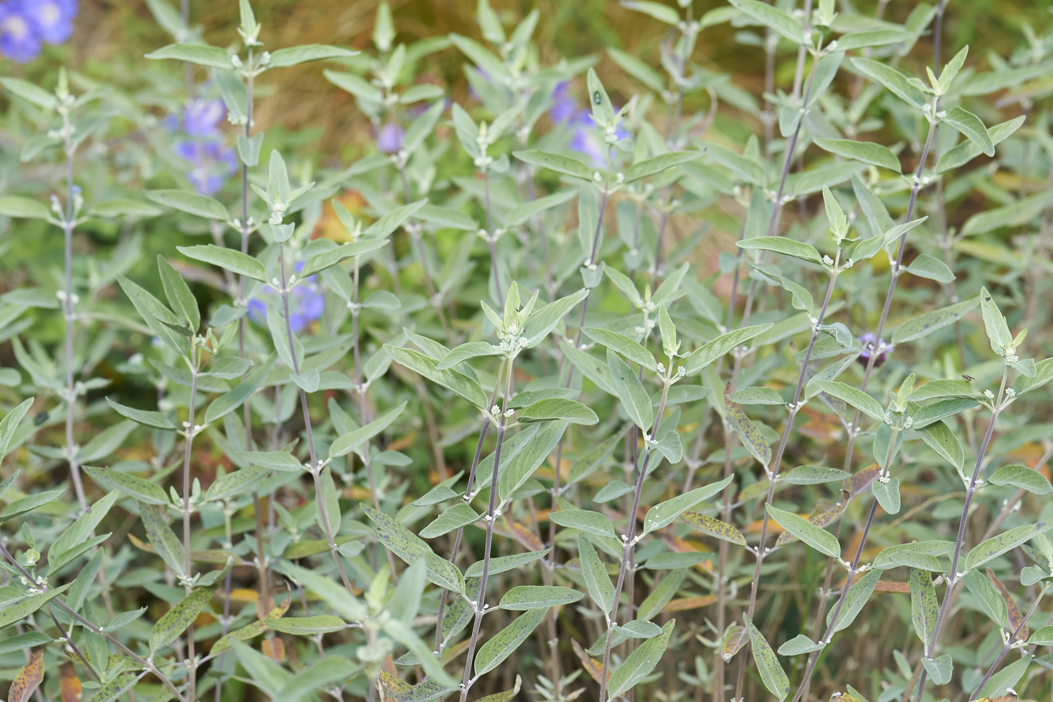 Op de foto zie je blauwbaard, Caryopteris clandonensis, een laatbloeiend laag struikje met grijsblauw blad en lavendelblauwe bloemen.