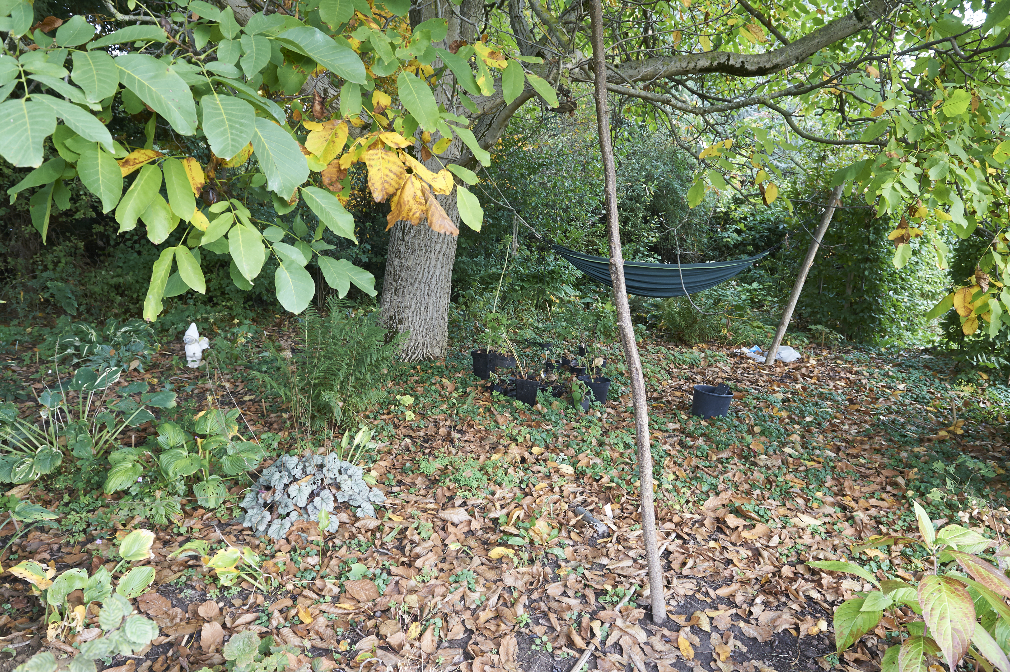 De schaduwtuin is ook toe aan een winterslaap. De hangmat wordt één deze opgeborgen, tot volgend jaar.