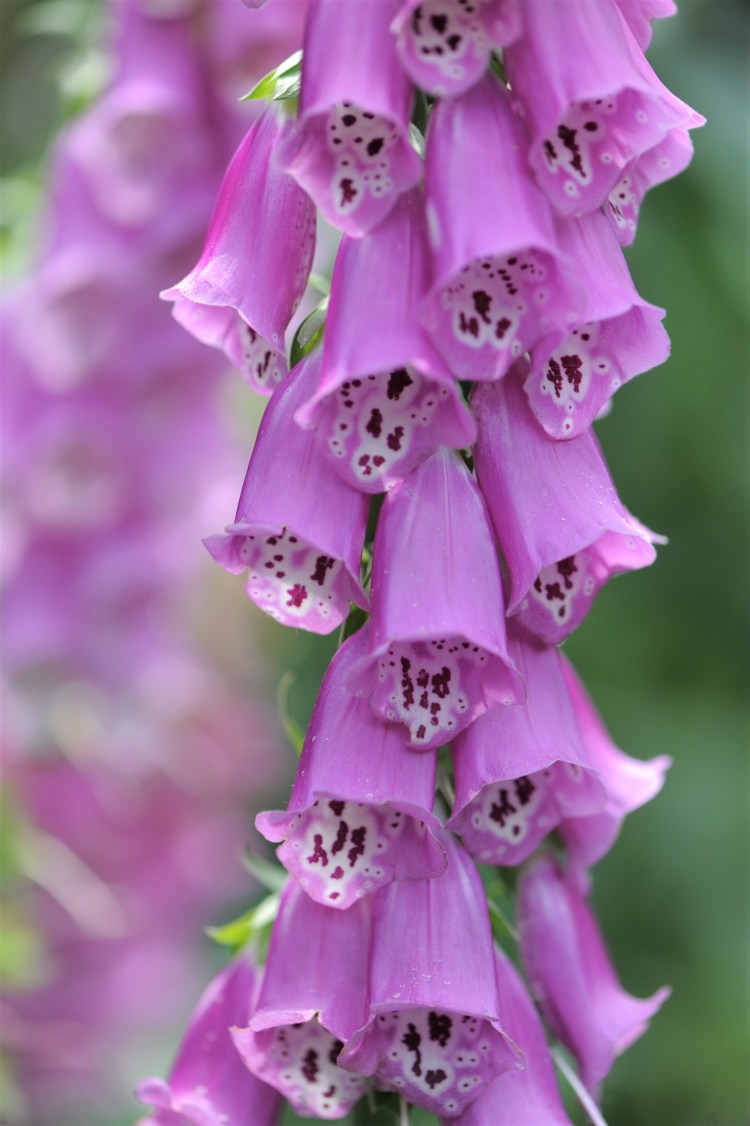 Dit vingerhoedskruid is spontaan opgekomen in de tuin. Deze groep staat tussen de zwarte bessen. Ik heb er ook terug één witte staan. Wanneer er onbekende zaailingen opkomen laat ik de planten steeds groeien en bloemen vormen, zodat ik weet wat er groeit.