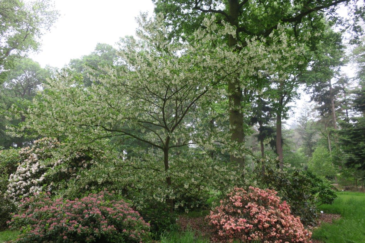 Ik overweeg al enkele jaren om een Pterostyrax corymbosus aan te planten.  Hij bloeit in juni met kleine witte, hangende bloemen die heerlijk zouden ruiken en zeer veel nectar en pollen bevatten. Bovendien verkleurt hij in het najaar geel, oranje of rood, afhankelijk van de grondsamenstelling. Na de bloei verschijnen ook nog kleine bruine vruchtjes