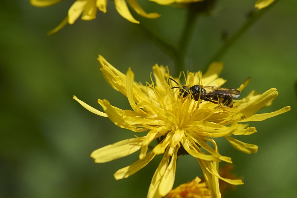 Deze groefbijendoder (Cerceris rybyensis), foeragerend op een margriet, is een knoopwesp. Ze vangt solitaire bijen en verdooft die (als voedsel voor de larven). Deze prooidieren worden in nestcellen begraven; 10 tot 15 cm onder de grond. Het is een solitaire wesp die ik hier al een aantal jaren zie rondfladderen, op dit ogenblik voornamelijk in de bloemenweide, logisch omdat daar nu ook de grootste concentratie solitaire bijen te vinden is.