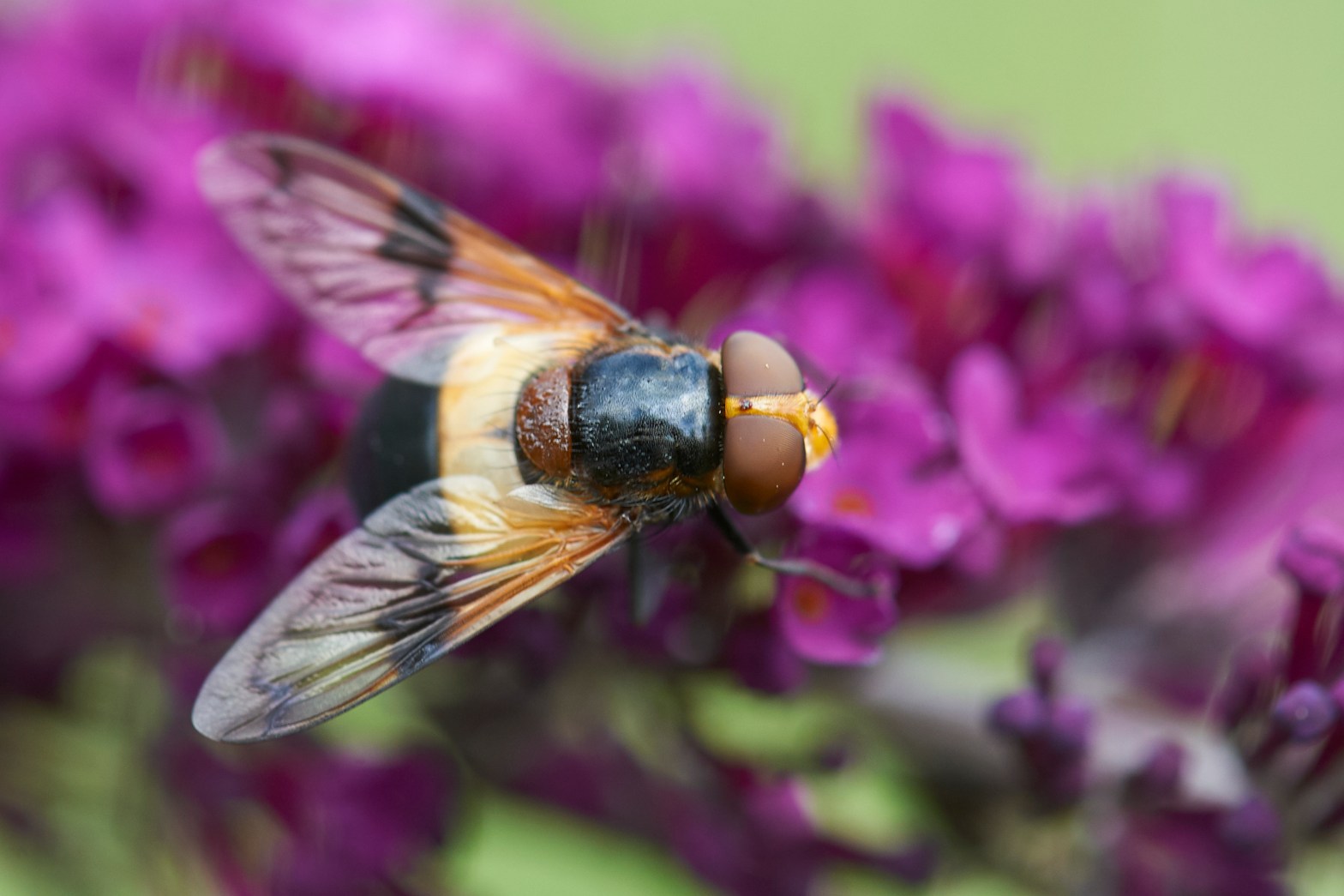 De Stadsreus (Volucella zonaria) is hier al enkele keren aanbod gekomen. Deze Witte Reus (Volucella pellucens) kon ik nu voor de eerste keur voldoende goed in beeld brengen. Deze is iets kleiner (15-18 mm) en imiteert een hommel. De larven parasiteren in wespennesten en hommelnesten.