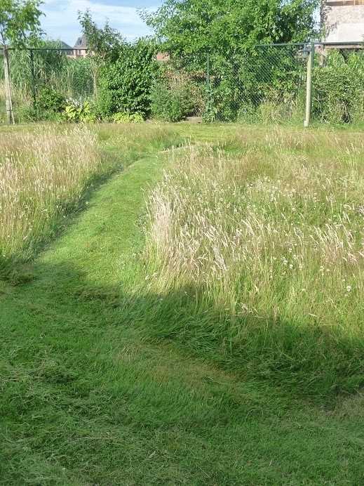Ik heb voor mezelf al een tijdje uitgemaakt dat ik mijn gazon nog maar heel sporadisch maai. Ik heb dat de vorige keer ten dele gedaan met de zeis. Het oppervlak is niet zo groot, en werken met de zeis is gewoon veel leuker, en het geeft me extra oefening. Want zo één keer per jaar een stukje bloemenweide zeisen, dat is gewoon onvoldoende om de techniek te beheren.