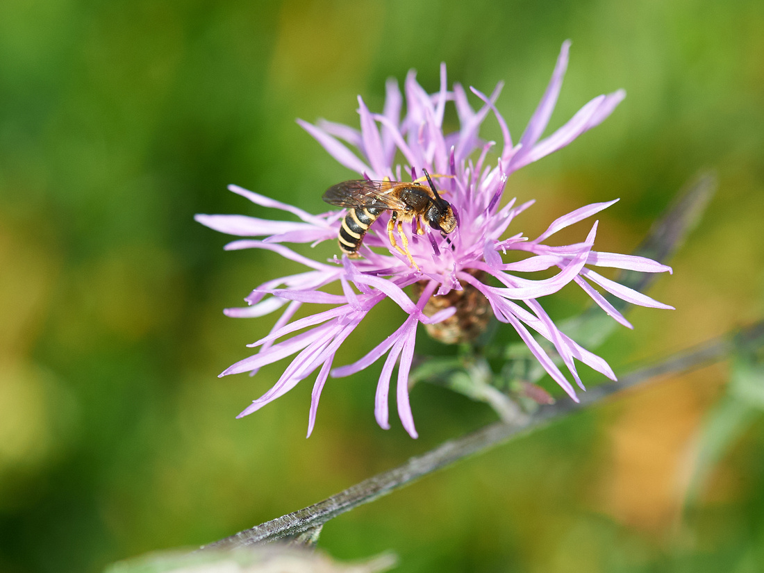 Centaurea jacea is een inheemse plant die ik gewoon in de tuin aanwend. Het is een erg gracieuze plant die in de voortuin al maanden in bloei staat. Op deze foto zie je ook een Breedbandgroefbij, één van de solitaire bijen die ik hier vanaf juni tot september tegenkom. Een andere Centaurea die na drieMeer lezen over “Centaurea”