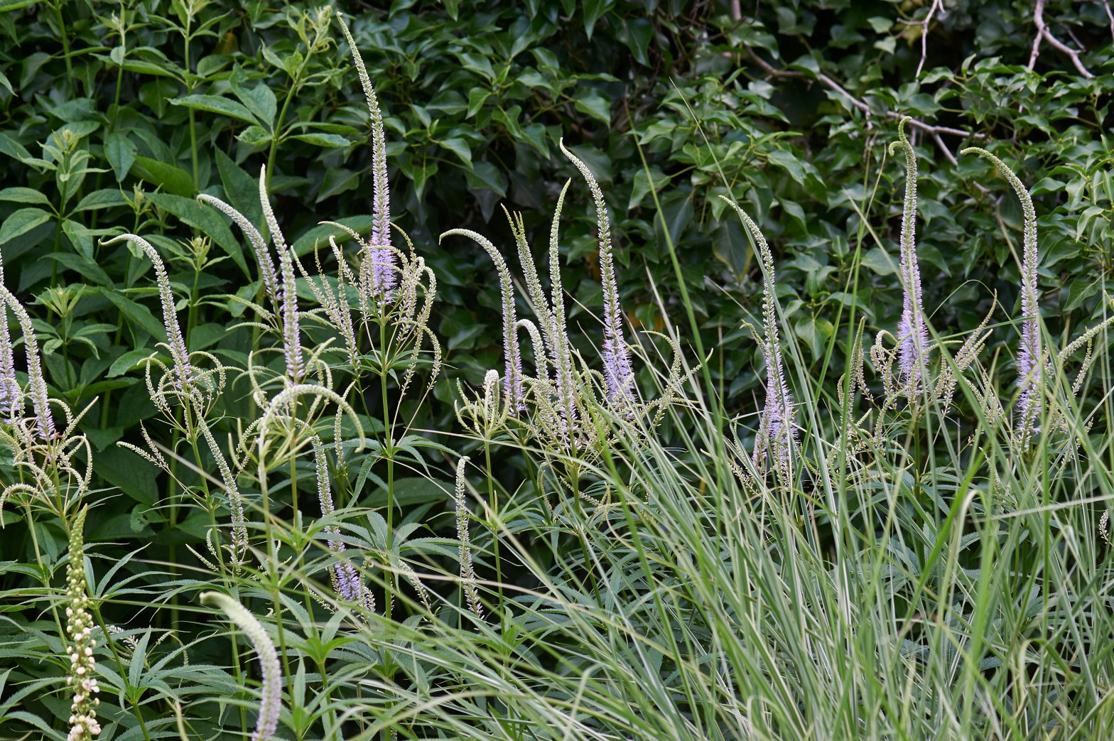 Allium sphaerocephalon en Veronica longifolia, met nog wat Stipa tenuissima en wat Papaver rhoeas in de achtergrond
