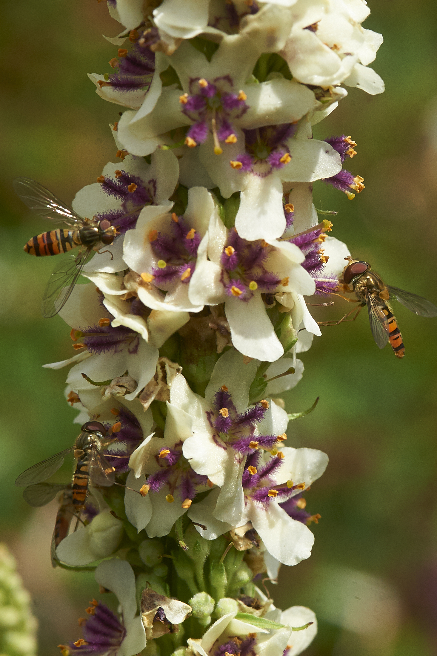 De snorretjes zitten ook en masse op de Verbascum chaixii. Ik vermoed dat er een een vijftiental van deze zweefvliegen rondcirkelen en foerageren op iedere plant. Er staan hier een twintigtal van deze planten in bloei, geeft een idee van de drukte. Dat stopt in de late voormiddag, dan zijn de bloemen van die dagMeer lezen over “Drukker”