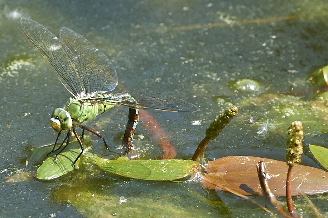 Deze schoonheid voor de eerste keer aan de vijver gespot, tijdens het afzetten van eitjes. Ze werd daarbij voortdurend gestoord door platbuiken én kikkers.